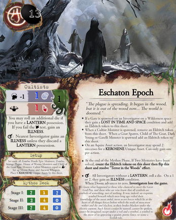 This expansion contains Cthugha, Nyogtha, Nodens, Zoth-Ommog and Great God Pan. There are new location encounters, conditions, disasters, assets, artifacts, spells, exhibit assets, unique assets, scientific assets, monsters and investigators.